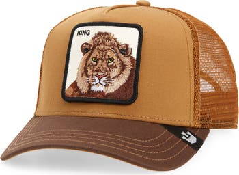 An embroidered lion patch adds a wild style to this Goorin's Trucker cap.
