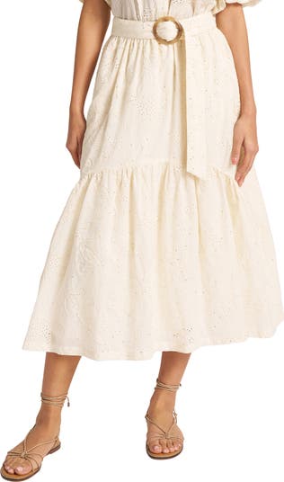Airy eyelets charm this flouncy tiered skirt cut from breezy cotton and topped with a drapey ring belt.