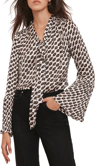 Black lip print blouse featuring a pussy bow neckline, long sleeves and fluted crinkle cuffs.