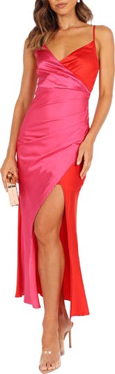 Bold color splicing intensifies the contemporary allure of a satin slipdress complete with a dramatic side slit.