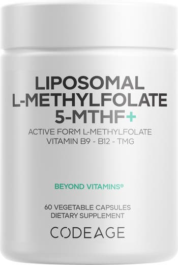 Codeage Liposomal L-Methylfolate 5-MTHF+ supplement provides L-Methylfolate (Vitamin B9) and Methylcobalamin (B12) in their active form, as well as Pyridoxal 5-Phosphate (B6), enhanced with TMG and Codeage proprietary Helix liposomal delivery. 2-month supply.