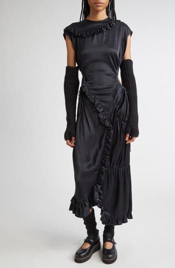 Meruert Tolegen gives fresh life to Victorian frills with this lustrous satin midi dress that celebrates your shape with sultry waist cutouts, soft gathers and cascading ruffles. Each piece is hand-sewn in New York's historic Garment District.