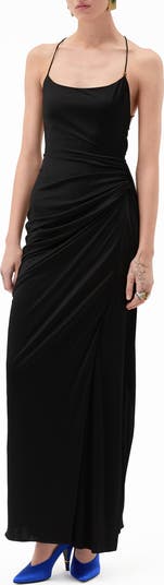 Lustrous jersey brings liquid drape to this side-ruched gown tethered by delicate spaghetti straps and fashioned with an open back and leg-baring side vent.