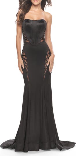 Strapless liquid jersey dress with mesh strappy side panels. Lace up strappy back. Back zipper closure.