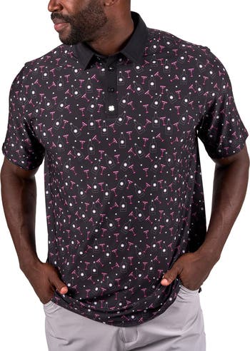 Our Liquid Luck polo in black features pink embellishments with icons of spirits. Crafted from a poly blend performance mesh, it offers breathability, moisture-wicking capabilities, and 4-way stretch. With low shrinkage and shape retention technology, it’s your go-to for all-day comfort and style.