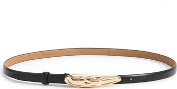 A molten buckle gleams at the center and puts a dramatic touch on this slender leather belt.