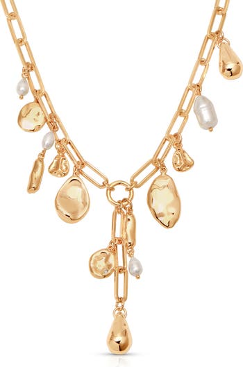 This dimensional necklace plated in 18-karat gold features a Y silhouette strung with hammered beads and glowing pearls for organic-inspired shine.