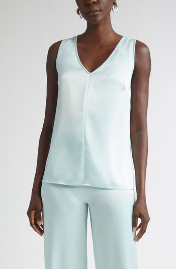 A V-shaped neckline and a fluid fall give this satin tank a quiet drama that works hard in any wardrobe. The lustrous surface catches light with every move and the featherweight feel makes it an ideal base that still holds its own.