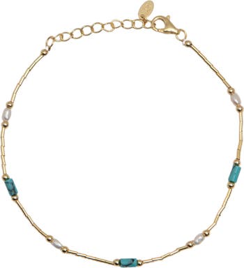 Cultured pearl and turquoise stations bring an oceanside glow to this sterling silver bracelet plated in 18-karat gold.
