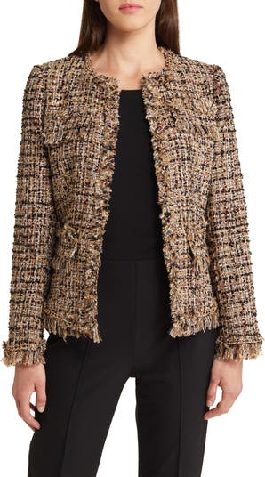 Bouclé tweed with feathery fringe accents adds rich texture to this elegant jacket styled with front pockets and goldtone-chain detail.