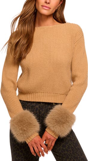 Furry cuffs add texture and volume to this woolly ribbed sweater made with a dipped crossover back.