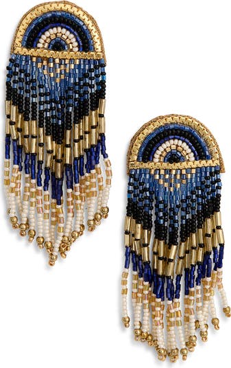 Intricately beaded fans suspend colorful chevron-fringe drops on these statement earrings that shimmer and sway with every movement.