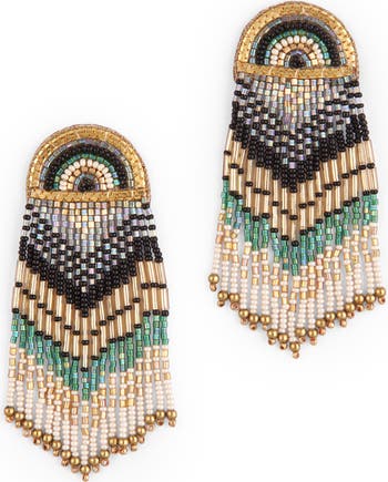 Intricately beaded arcs suspend colorful chevron-fringe drops on these statement earrings that shimmer and sway with every movement.