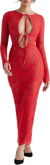 A crystal trim brings flirty elegance to this semisheer lace dress fashioned with a peekaboo front and vented scallop hem.