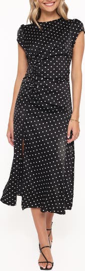 Timeless polka dots pattern a smooth satin midi dress framed by dainty cap sleeves, elegant ruching and a sultry side slit.