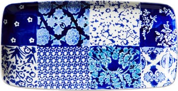 add a touch of vibrant style to your table with this rectangular platter. made from indigo blue stoneware, the platter features unique designs created using traditional techniques like wax resist, hand painting, and hand stamping. dishwasher safe.