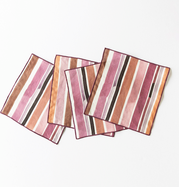 NEW to our cocktail napkin collection is the Lisbon Stripe set. Painted in pink and brown tones, they are cool and sophisticated. Designed to be as versatile as they are beautiful. Style as is for the perfect cocktail napkin or fold for a casual lunch napkin. Sold as a set of 4. 100% Linen 8x8 inches