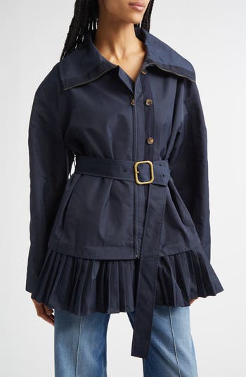 Layer for a chic, modern look in this midweight woven jacket styled to turn heads with a dramatic spread collar, grosgrain-accented placket, belted waistline, and crisp pleats at the hem for a playful finish.