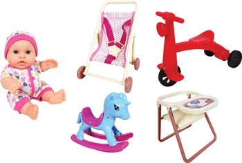 LISSI: 8" BABY DOLL: SCOOTER, PUSHCHAIR, ROCKING CHAIR & highchair SET - Introduce your little one to the world of imaginative play with the enchanting 8" Baby Doll Playset. This delightful collection includes a charming 8-inch baby doll, along with a stylish scooter, a convenient pushchair, a lovely highchair, and a cozy rocking chair—all designed to inspire endless hours of creative role-playing fun. The adorable baby doll comes dressed in a cute pink outfit, making her the perfect companion for your child’s adventures. Whether it's a stroll through the park in the collapsible pushchair or a cozy seat at the table in the highchair for pretend feeding, this set is designed for easy transport and storage, ensuring that playtime can happen anywhere. Your child can let their imagination soar as they create various scenarios. They can take the baby doll on exciting outings on the scooter or settle in for a relaxing time in the vibrant rocking chair. Each piece in this set encourages interactive play, allowing children to explore real-life nursery activities and develop essential social skills. INCLUDES: 1 doll, 1 scooter, 1 pushchair, 1 rocking chair, 1 highchair.