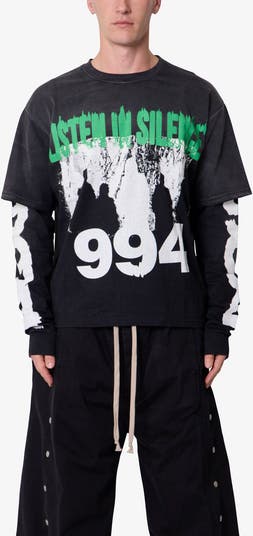 Heavy washing with an added spray effect break in the fit and feel of this layered T-shirt stamped with distinctive graphics coming and going.