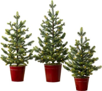 Bring some country flair to your holiday season with this set of three tabletop trees in a lifelike rendition that's shrunk down to a mini size. They each come in a cute metal bucket and have a built-in timer that keeps the lights on for 6 hours and off for 18 hours.