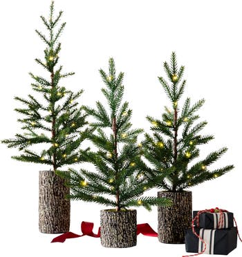Welcome the season with the charming look of baby evergreens. Nestled in textured bark pots, these saplings add a rustic touch to mantels and tablescapes. Built-in timers can be set for six hours of continuous illumination.
