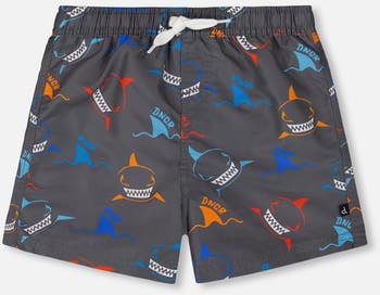 Little Boy's Printed Boardshorts Orange, Red, And Blue Sharks On Gray