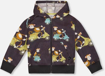 Little Boy's Printed French Terry Hooded Full Zip Cardigan Sweatshirt Monkey On Navy Moped