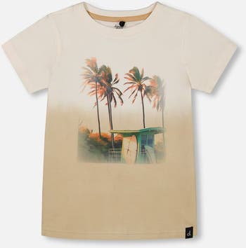 Add a touch of California style to his wardrobe with our Short Sleeve Organic Cotton Graphic Tee Gradient White and Beige. This tee features short sleeves, a crew neckline, and a vintage Malibu photo print with a surf shack and palm trees. Team it with any bottom in our Malibu Sands collection for a playful head to toe look!