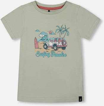 Our Short Sleeve Organic Cotton Graphic Tee Sage and Multi is oh-so-adorable with a vintage graphic surfing paradise print. A cute and comfy option that he'll wear all spring and summer long, this tee features short sleeves, a round neckline, and a small logo label at the hem. It mixes and matches perfectly with every bottom in our Malibu Sands collection!