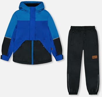 Little ones will stay warm and dry when they're layered up in our Two-Piece Mid-Season Outerwear Set Royal Blue and Black. This waterproof set features a hooded jacket with a polar fleece lining, a zip front closure, a windstopper placket, elastic wrists with adjustable cuffs, and reflective accents. We've teamed it with an elastic waist pant with elastic ankles, reflective tapes, and reinforced knees to protect against wear and tear.