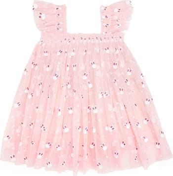 This dreamy pink tulle dress is ready for a twirl, complete with ruffly cap sleeves and a skirt covered in tiny bouncing bunnies for a magical springtime look.