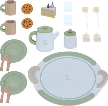 - Includes tea pot, lid, two teabags, two teacups, two plates, two forks, two knives, sugar bowl with lid, two sugar cubes, two cookies, cake piece and tray