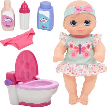 It's Potty time! Baby doll with her very own potty. Flush the potty to hear fun sounds. Set comes with a 10" baby doll dressed in a cute, colorful outfit with matching headband , potty, baby bottle, 2 play bottles and 2 fabric diapers.Kids will love role palying with the doll as they learn how to use the potty themselves.