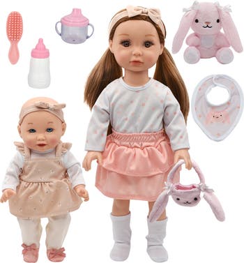 Little Darlings Sweet Sisters, 18” big sister & 12” baby sisterSisters who love to play & have fun together! 18” big sister and 12” baby sister that talk to each other! Press their chest to hear 6 different phrases they say to each other. Set includes bib, feeding bottle, sippy cup, brush and plush pet.