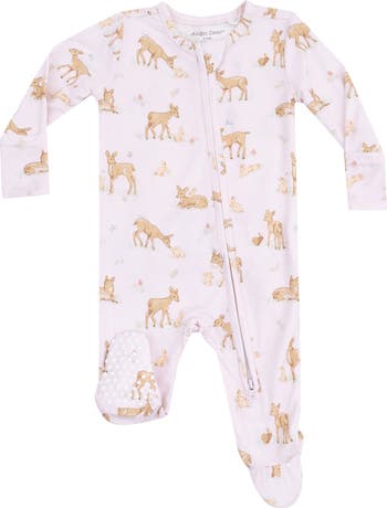 A zip closure that runs from shoulder to ankle allows for quick dressing and easy diaper changes in a patterned footie made from soft, stretchy fabric.