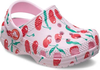 A cherry print sweetens this classic clog scaled-down for baby with the same porthole detailing that creates ventilation and room for fun charms.