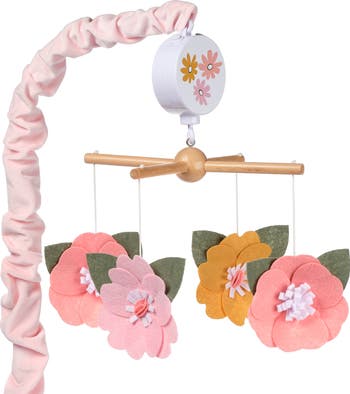 Four custom designed layered felt flowers in pink, strawberry and goldenrod rotate slowly around this charming wooden arms musical crib mobile. It plays nursery songs for 20 minutes, has an on/off switch, and volume control. It plays Brahms Lullaby, Twinkle, Twinkle Little Star, and Rock-a-By-Baby. The scrunchie, which covers the mobile arm, is made in a pretty pink velour. Requires 3 AAA batteries not included.
