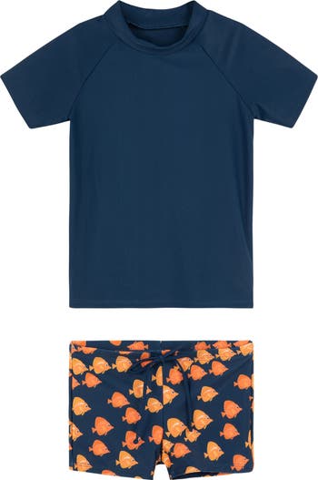 Ready, set, splash in the Little Gents Short Sleeve Swim Short Set! Designed for all-day comfort and sun protection, this set features a short-sleeve swim top and matching swim shorts with front lining. Perfect for active water play, it offers built-in UPF protection and chlorine resistance for long-lasting wear.\nReady, set, splash in the Little Gents Short Sleeve Swim Short Set! Designed for all-day comfort and sun protection, this set features a short-sleeve swim top and matching swim shorts with front lining. Perfect for active water play, it offers built-in UPF protection and chlorine resistance for long-lasting wear.