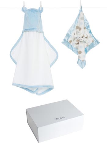 This incredibly soft set that pairs a hooded bath towel with a coordinating plushie blanket makes for a perfect baby gift.