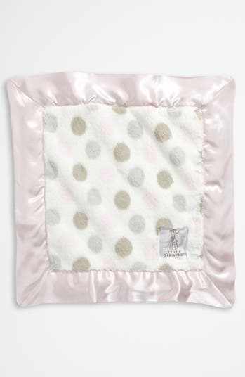 Softly textured blanket in plush, polka dot faux fur is edged in silky satin.