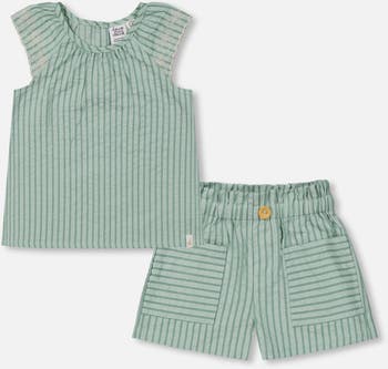 Little Girl's Chambray Blouse And Short Set Mint Green Striped