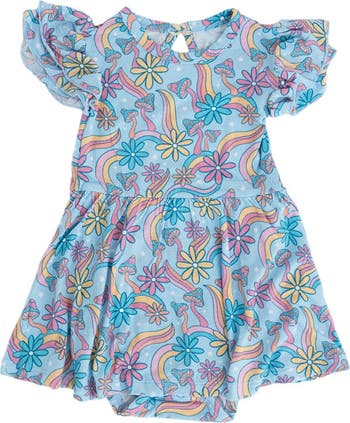 This adorable and comfortable twirl dress is perfect for any little girl. Made from soft and sustainable fabric, this dress features a charming all-over print and a full gathered skirt for twirling. The dress also has a bodysuit underneath for added coverage up to size 18-24M. Up to size 18-24M also has crotch snaps for easy changes and a button loop behind the neck for easy dressing.