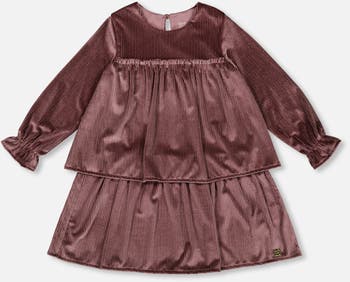 Little Girl's Long Sleeve Metallic Dress With Frills Burgundy