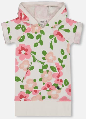 Little Girl's Printed French Terry Hooded Dress Pink Flowers On White Background