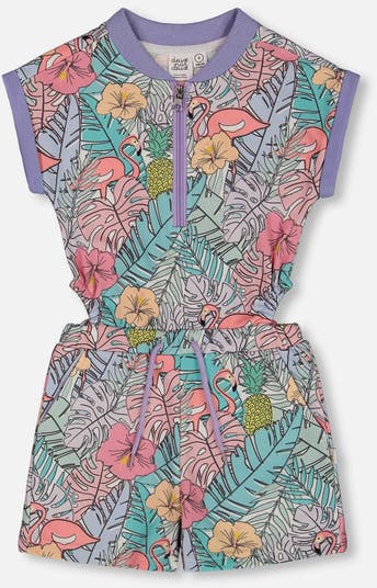 Little Girl's Printed French Terry Romper Lilac Tropical And Pink Flamingos