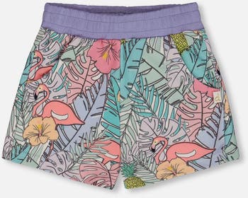 Little Girl's Printed French Terry Short Lilac Tropical And Pink Flamingos