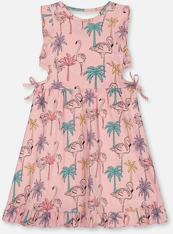 Little Girl's Printed Organic Cotton Dress With Cut Outs Palm Trees, Pink Flamingo, And Turquoise