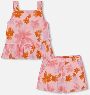 Little Girl's Printed Tank Top And Short Muslin Set With Frills Pink And Coral Flowers