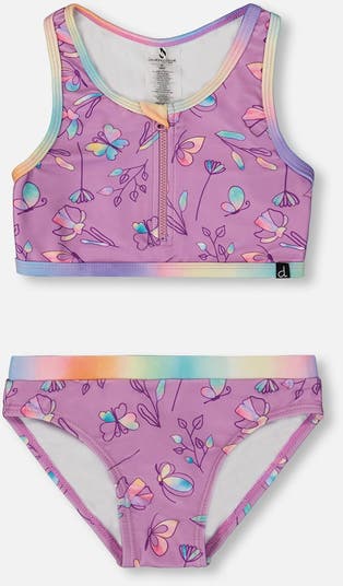Our Printed Two-Piece Swimsuit Old Mauve and Multicolored Butterflies offers a colorful look and a comfortable fit, making it a perfect choice for any active little girl. This set features a cropped rashguard top with a scoop neck, a zip front closure, and contrast tie dye trim. We've teamed it with a matching butterfly print bikini bottom with a tie dye band at the waist.